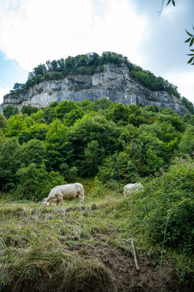 Na een wandeling die wel als ongeveer 2 km voelde kom ik weer aan bij Baume-Les-Messieurs. Ik stop nog even bij het openbare toilet voor ik weer tussendoor terug loop, langs de koeien die maar boffen met een wei in zo een prachtige omgeving, terug naar de parkeerplaats. Mijn app zegt dat ik ruim 17km heb gelopen tot dan toe voor de hele dag. Dus 2km van het dorp door de wildernis naar de waterval? Daar lijkt het niet op, maar ik zou het zo weer doen.