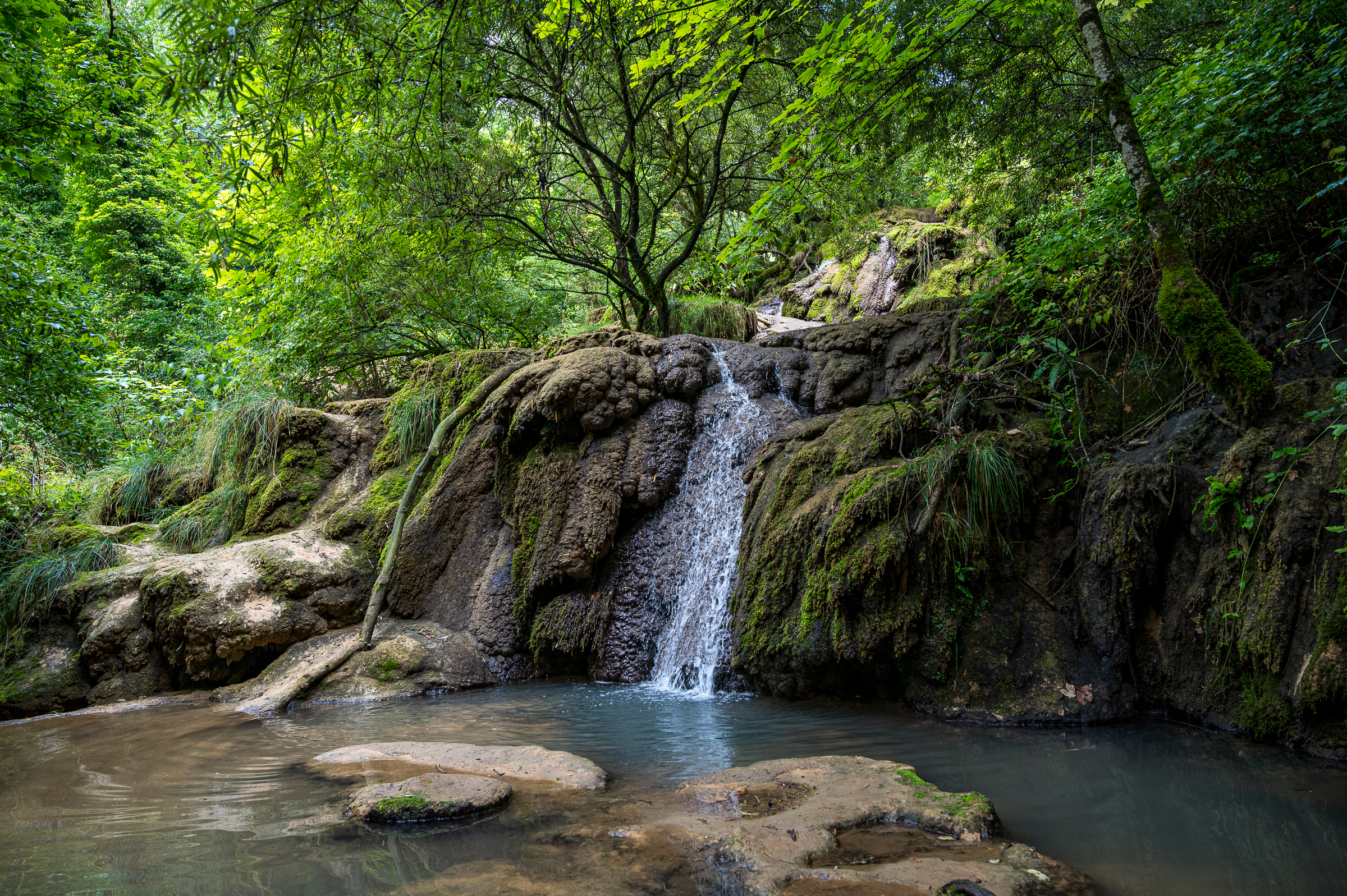 Weer beneden hoef ik slechts de mensen te volgen om de waterval te vinden en in de verte zie ik al mensen die foto’s staan te maken met hun telefoons. Kom ik dan aanlopen met mijn professionele apparatuur, maar ja dat ben ik inmiddels wel gewend. Ik begrijp wel waarom al die mensen hier zijn en foto’s staan te maken overigens, want de waterval is echt mega indrukwekkend. De kalksteenafzetting heeft een gigantisch netwerk van geulen gordijnen en bulten gevormd waarop mos groeit en water over en langs stroomt. Er is zelfs een grot gevormd waar het zo donker is dat je binnenin niets ziet. Het doet me heel erg denken aan de Cascade des Tuffs bij Arbois maar dan nog veel groter.