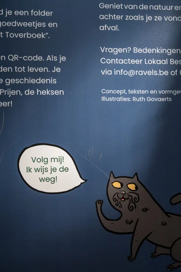 We pakken één van de boekjes met meer informatie en extra opdrachten en gaan op pad. De kat Clara wijst de weg dus wij starten de wandeling door de richting op te lopen waar het neusje van de kat heen wijst. Of wijst ie met zijn pootje? Beide wijzen dezelfde kant op en al snel komen we bij de eerste bladzijde uit het verhaal. Hier ontmoeten we Gust en met hem zullen we dit avontuur gaan beleven om uiteindelijk de Hoogeindse berg te gaan beklimmen.