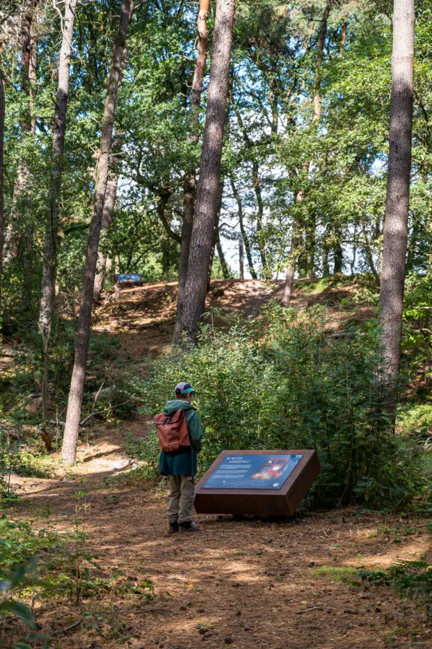 Dat we het hadden gevonden was ook niet te missen want er stond een groot spandoek in het bos. En op dat spandoek de uitleg van het verhaal en hoe je de route kan vinden.