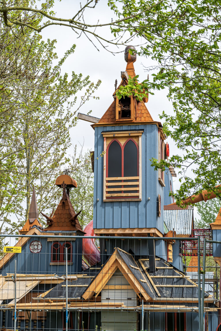 Ook helemaal achterin waren ze nog druk bezig met het bouwen van een gigantische nieuwe speeltoren, op de plek van de oude modderplaast. En om nu met water te spelen zagen we een grote sprookjesboom met waterspeelplaats eromheen. Maar het was iets te koud (11 graden met een frisse wind) om nat te worden.